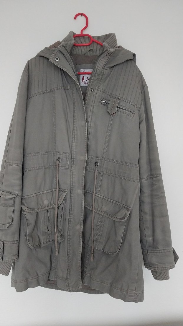gri renk, çıtçıtlı ve fermuarlı kapatma,keten kumaştan midi uzunlukta kadın kaban, şapkası aabittir. Boy omuz ortasından 79cm, kol 75,5cm, gögüs 51cm,Rahat kesimi ve uzun kollarıyla günlük sokak stiline uygun. sağ cepte sökük var görselee paylaştım.marka yards