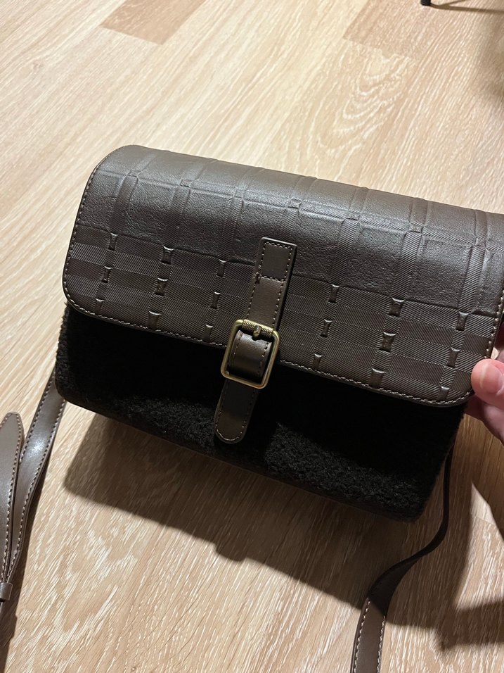 Kahverengi deri tokalı kapaklı, desen içermeyen klasik tarzda, günlük kullanıma uygun kadın çantası.