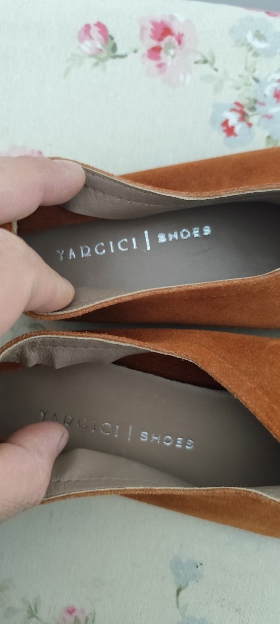 Bej süet malzemeden üretilmiş, dolgu topuklu ve tokalı kadın günlük ayakkabısıdır. Normcore tarzıyla günlük kullanıma uygundur. Yarcici Shoes markalıdır. Oldukça pahalı, lüks bir marka ve modeldir. Ünlü birinden hediye gelmişti zamanında. Kendisi hiç kullanılmamış diyebilecek kadar az kullanmış. Sıfır niyetine alabilirsiniz. O kadar tertemiz. İç kısmındaki yazılarda en ufak silinme dahi olmamis.