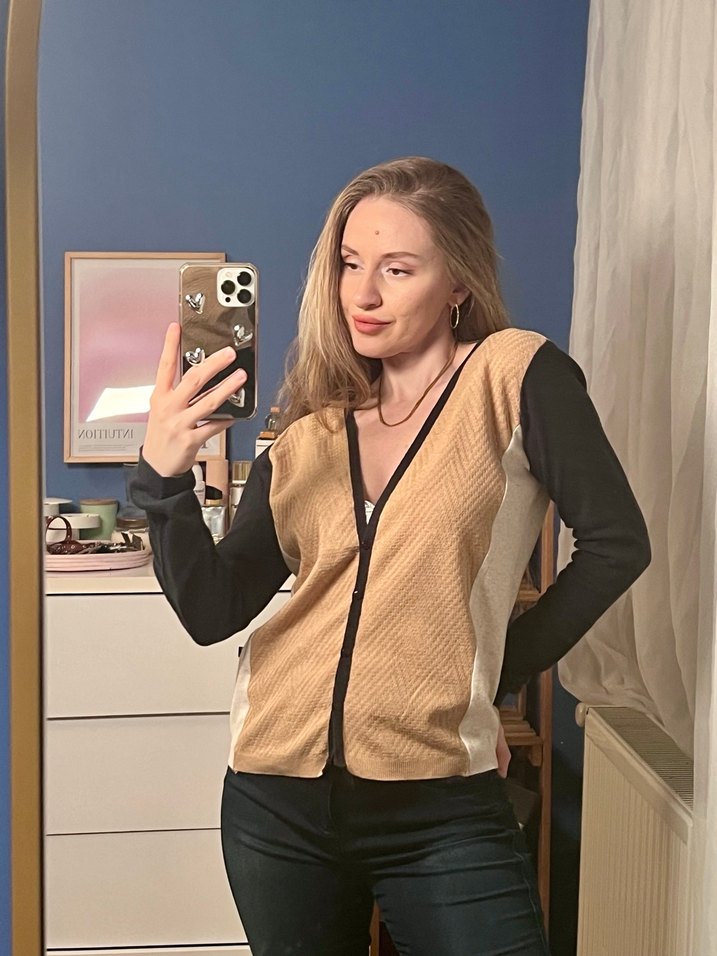 Bej renkli, V yakalı ve uzun kollu triko hırka. Normal midi boyda ve regular fit kesimlidir. Desensiz tasarımı günlük kullanıma uygun şık bir görünüm sunar.