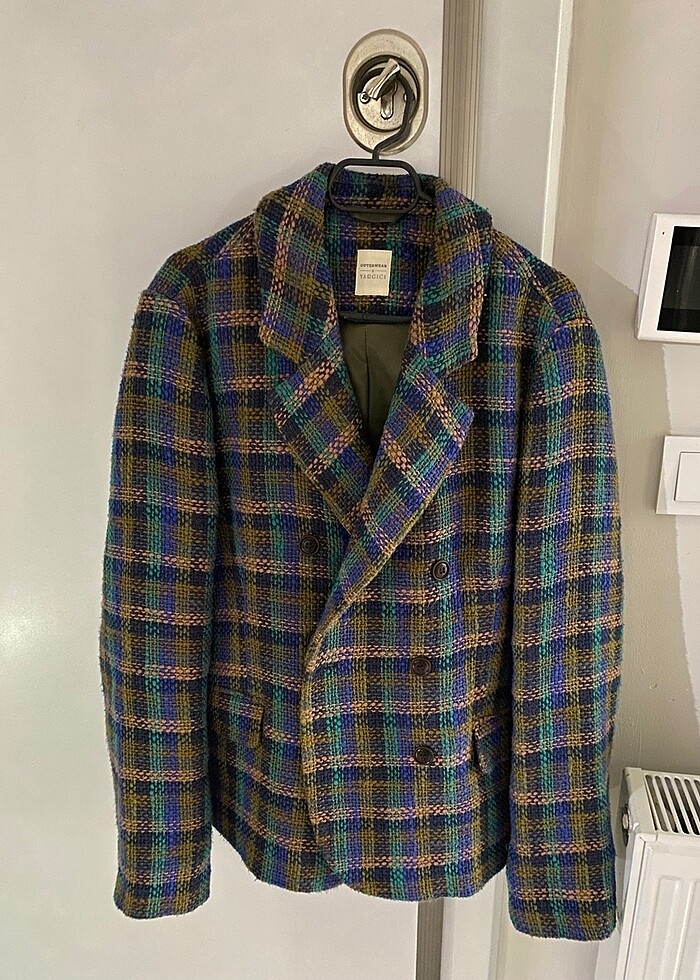 orta kalınlıkta bir ceket hafif oversize gibi bir kez giyildi hem spor hem şık bir parça