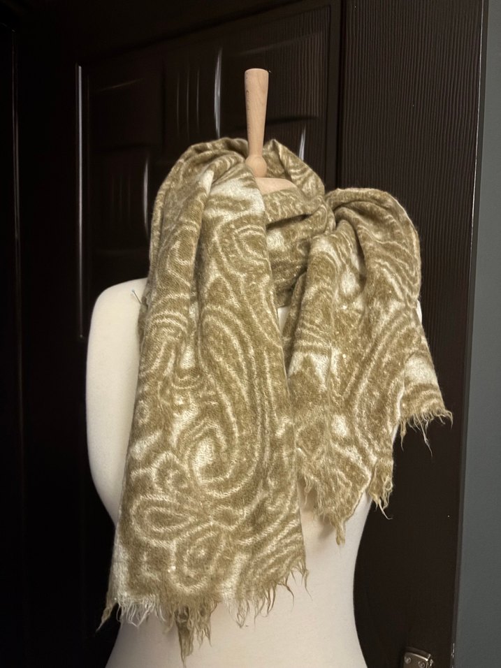 Az ve temiz kullanıldı yargıcı yün şal Bej keten kumaştan, gri tonlarda bohem desenli, drapeli ve rahat bir şal. Yumuşak ve nefes alabilir yapıda.