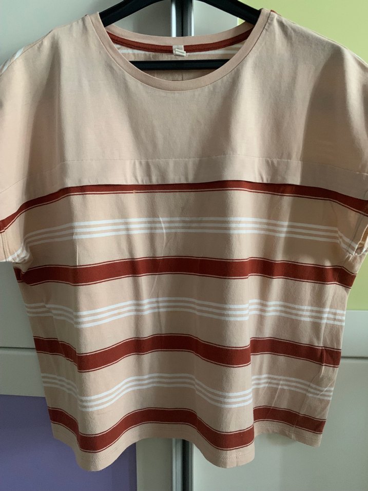 Pudra rengi kısa kollu, bisiklet yakalı ve Yumuşak pamuklu kumaştan, hafif yatay çizgili desenli #yargıcı #tshirt #m beden