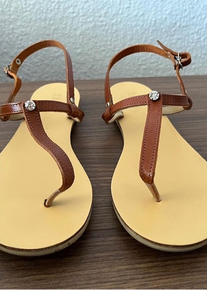 Deri kayışlı, üzerinde parlak taşı ile çok şık bir sandalettir. Çok çok az kullanıldı, hiçbir hasarı yok.