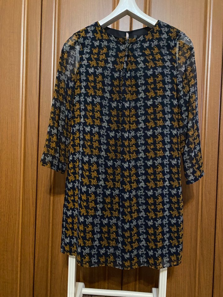 Yargıcı marka, içi astarlı, uzun kollu, yuvarlak yakalı şifon elbise. Lacivert üstüne taba ve gri desenleri ile ön yaka kısmında pilise detayı var. Bol ve rahat kesimli, diz üstü boyda, günlük şıklığa uygun bir elbise olup, ofiste de kullanılabilir. 38 beden, ölçüleri fotolarda mevcuttur.