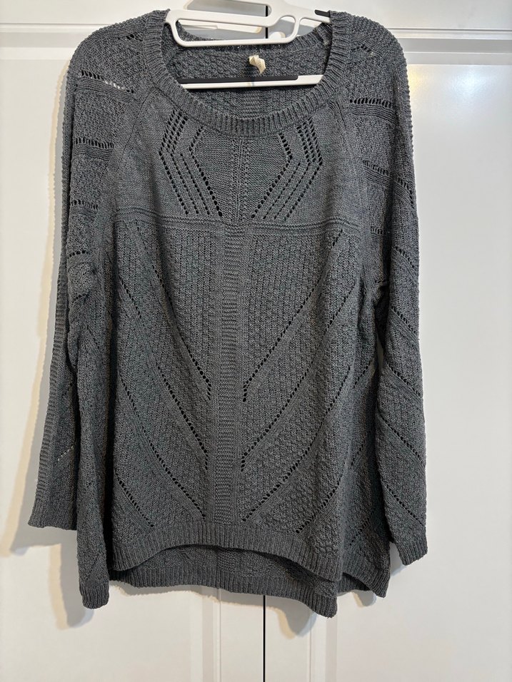 Gri mavi soluk renkli, uzun kollu ve yuvarlak yakalı örgü triko kazak, bol kesimiyle rahat ve bohem bir tarz sunar.