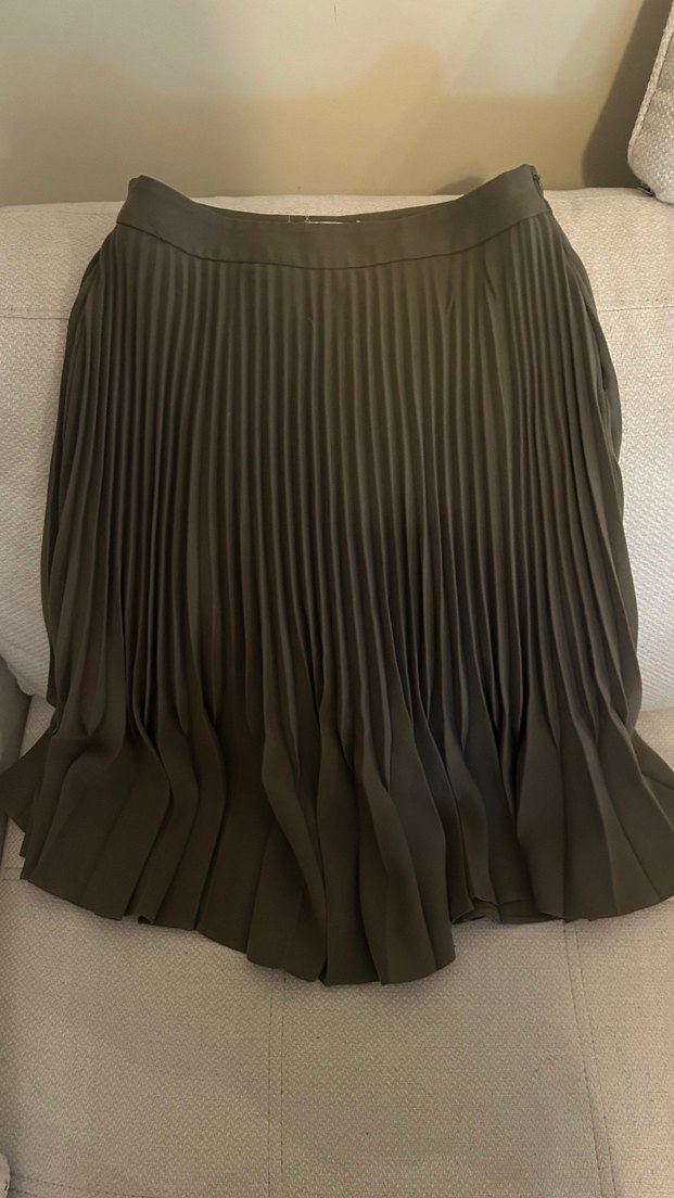 Haki renkte, sentetik kumaştan üretilmiş, pilili ve bol kesim midi boy kadın etek. Desensiz tasarımı ile ofis için uygun, şık ve avangart bir stil sunar. 36 bedene uygundur güle güle giyilsin