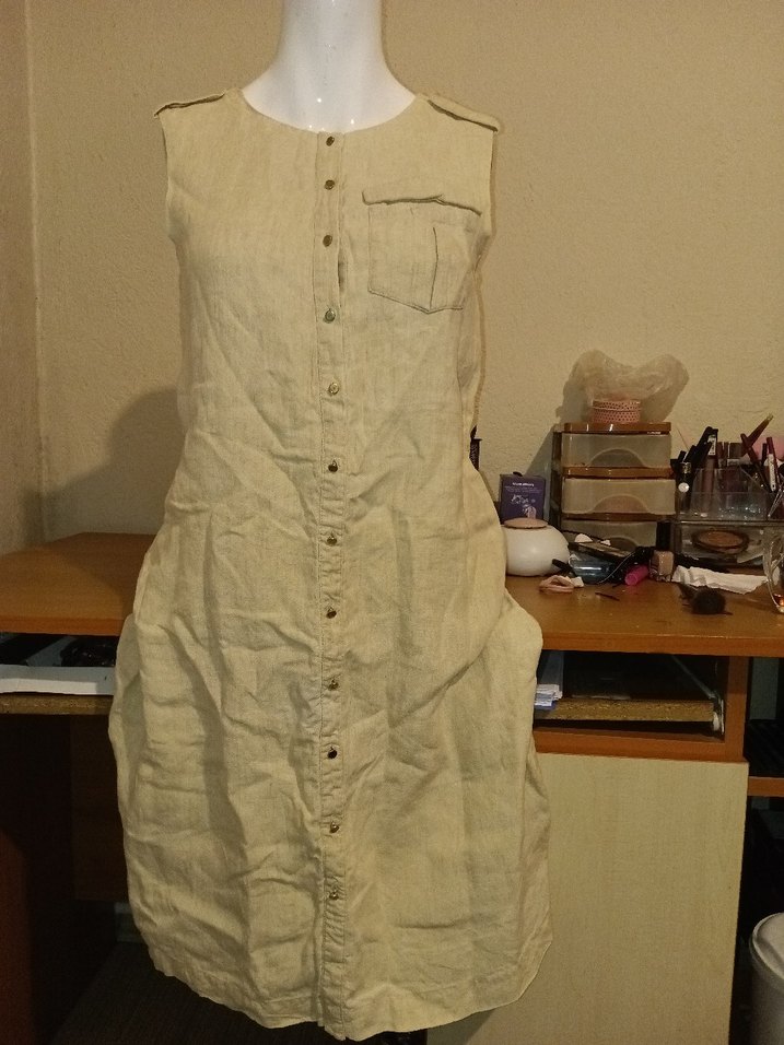 Orjinal mağazasından alindi.Bej keten midi elbise, düğmeli ön ve kolsuz tasarıma sahip. Notlu yaka ve tek cep içerir, rahat kesimiyle günlük kullanıma uygundur.