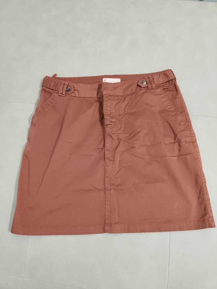 Kahverengi, bol kesim kadın eteği. Yumuşak sentetik kumaştan üretilmiş, günlük kullanıma uygun minimal ve sokak stili.