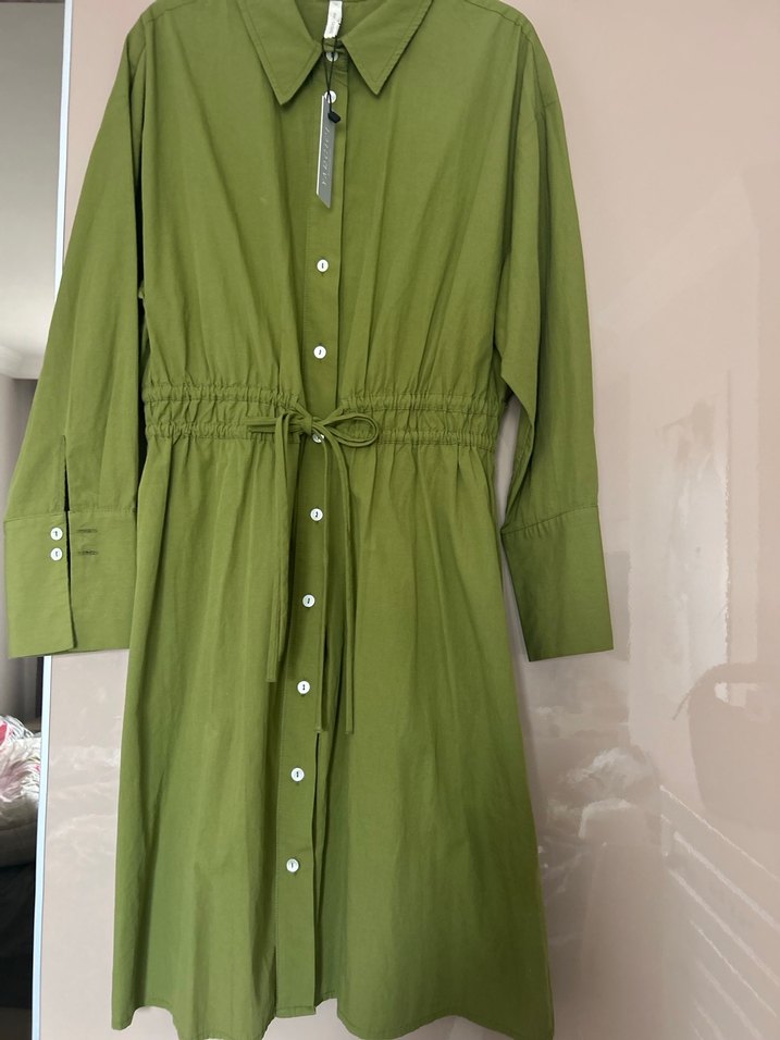 Haki renkli, pamuklu kumaştan uzun kollu elbise. Düğmeli, yakası kesik ve belinde bağcıklı, bol kesim rahat kullanıma uygun, desensiz tasarım.Tunik ve elbise olarak kullanıma uygundur. orjinal etiketli yeni sıfır üründür.