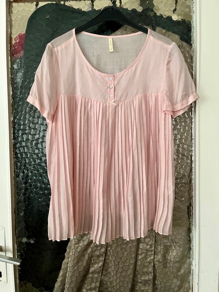 Yargıcı marka açık pembe renkli, kısa kollu ve yuvarlak yakalı önü pliseli detaylara sahip, bol kesim bluz. L beden. Sırt kısmında çok minik belli belirsiz defosu var, onun dışında hiçbir sorunu yok. Ölçüleri iki koltuk altı arası 50cm,boy 65cm.