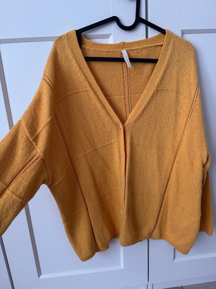 Sarı, örgü, V yakalı ve uzun kollu, bol kesim kadın hırka. Rahat ve bohem tarzıyla günlük kullanıma uygun, parlak dokusu ile canlı bir görünüm sunar.