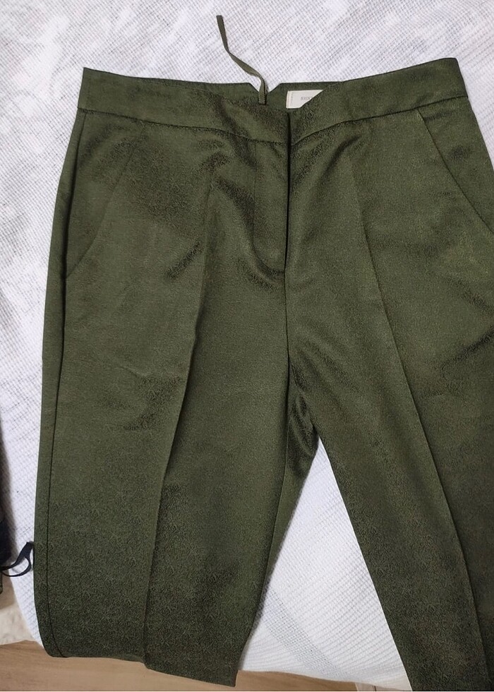 Tertemiz, 1- 2 kere giyildi, yeni gibidir. Rengi ve deseni çok orjinal, parlak kumaş, jakarlı. Kumaş üstü gömülü desenli. Koyu zeytin yeşili denilebilir rengine, fotoğraflarda rengi yansıtmaya çalıştım. Hakiye de yakın, ancak ışık vurunca daha çok koyu zeytin yeşili. Bel 36 cm, boy 93 cm