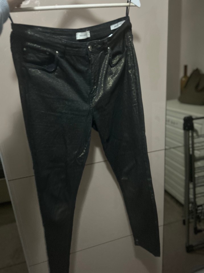 siyah sim baskılı altın rengine çalan pantolon, şık ve spor giyime uygun ve dar ve fit kalıp. Sokak stili ve parti için uygundur. Hiçbir deformesi yoktur.1, 2 kez giyildi.