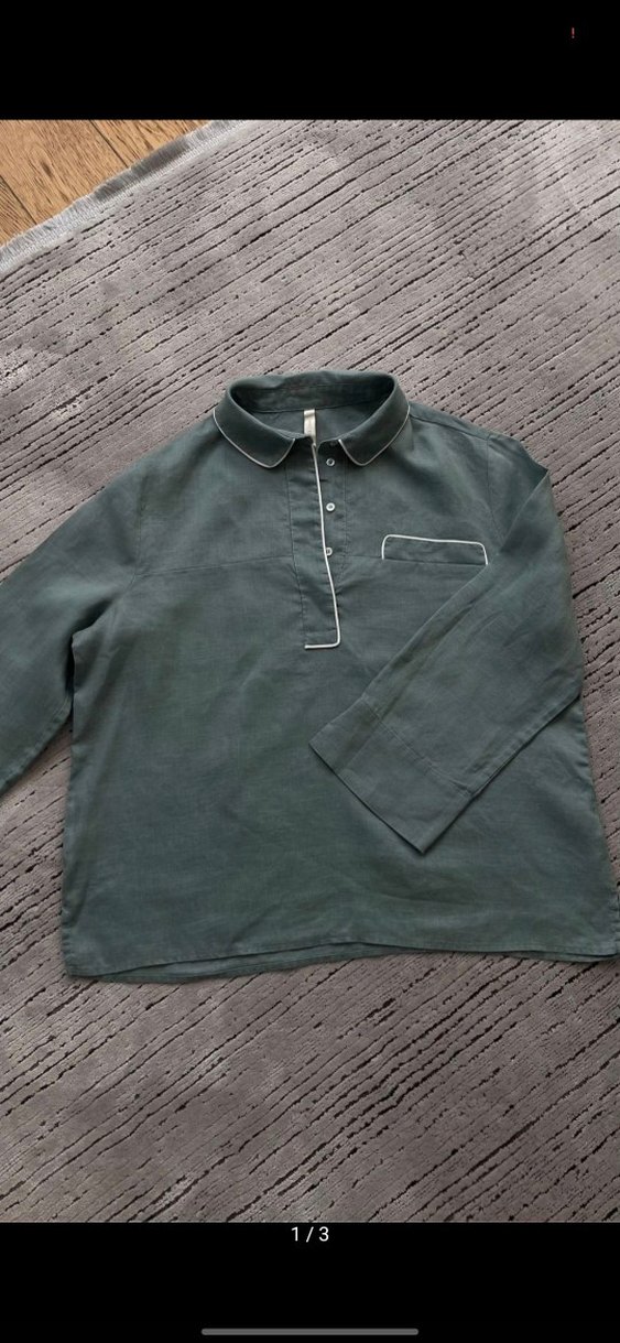 Gri keten kumaştan, uzun kollu, düğmeli ve yakalı gömlek. Cepte beyaz şerit detay bulunur. Günlük rahat kullanım için uygundur.