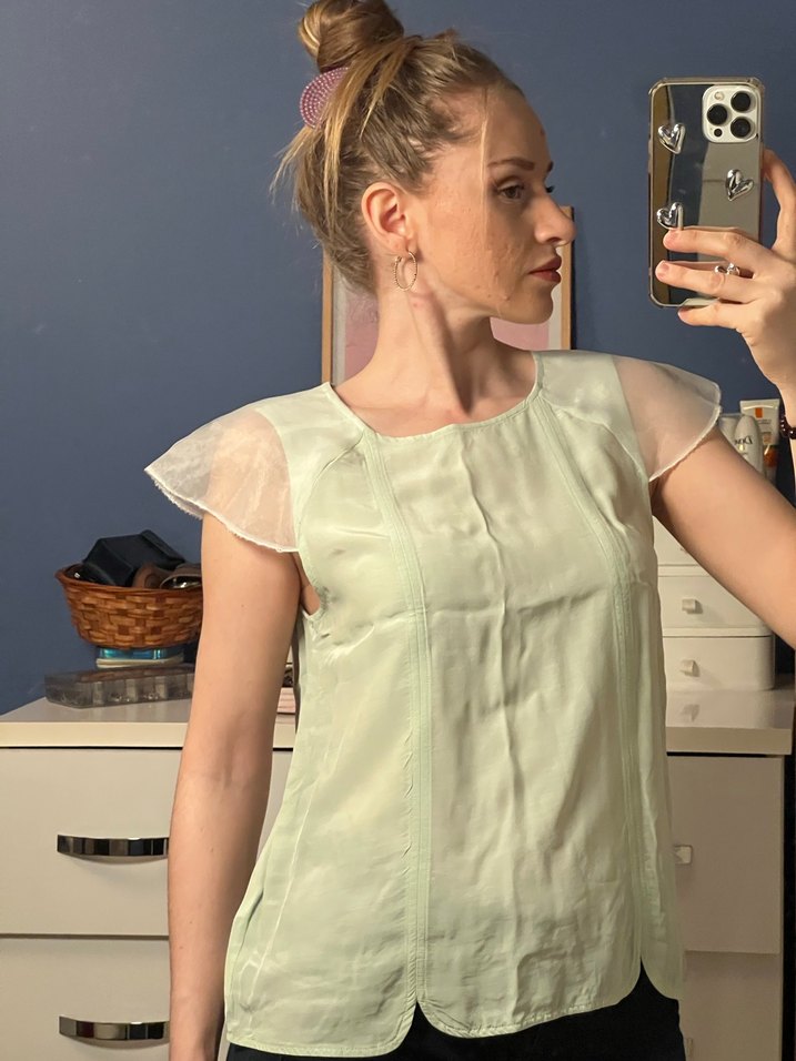Yargıcı Şeffaf, ince ve ipeksi kumaştan yapılmış, pastel su yeşili renkli, bol kesim kadın bluz.