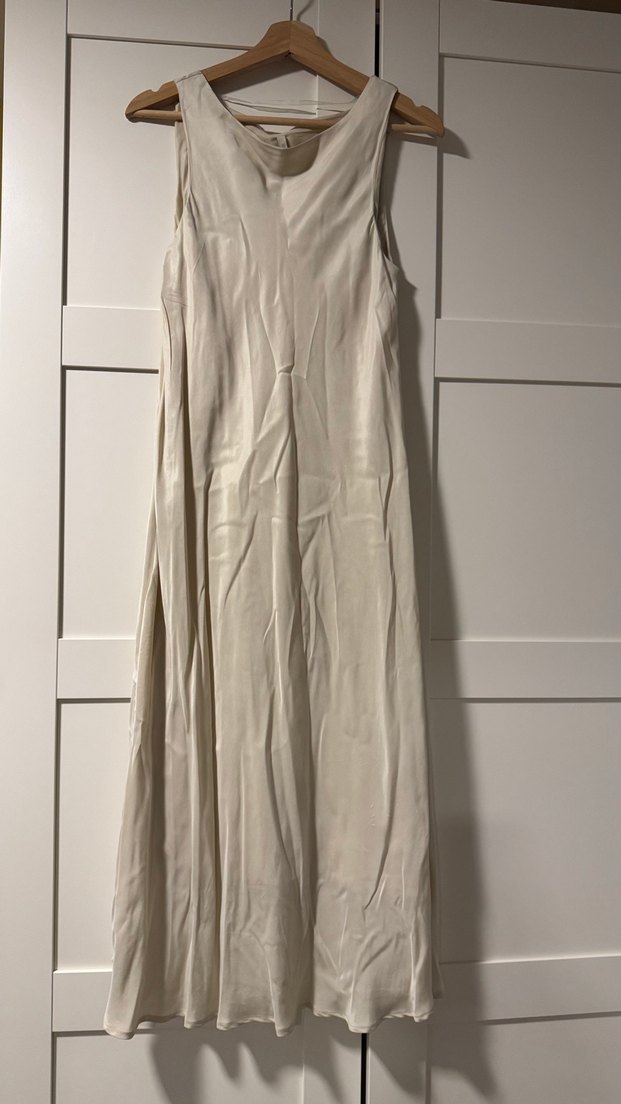 Keten kumaştan yapılmış, kolsuz, V yakalı, salaş kesim ve drapeli uzun elbise. Minimalist, bohem tarzda, ofis için uygun.