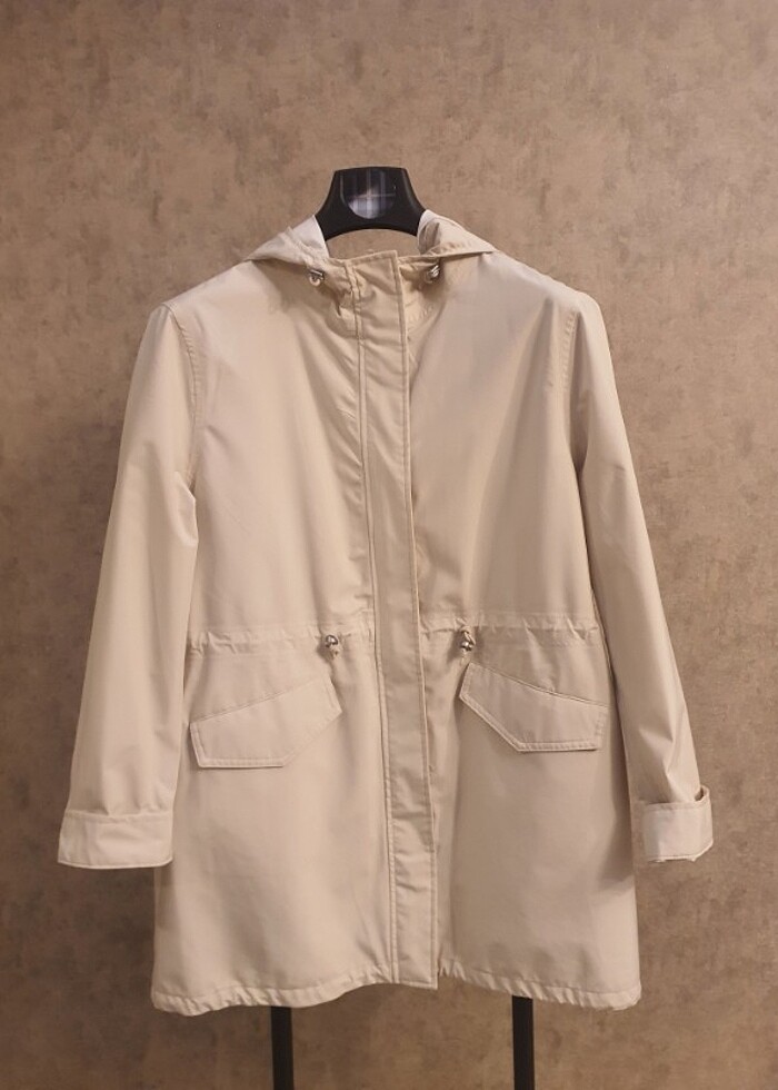 Polyester Markanın beden skalasında 2 beden Ön kısmı arka kısmından kısa Beli ayarlanabilir Kol düğmeleri marka amblemli Taş ile krem rengi arasında Astarsız Spor yağmurluk