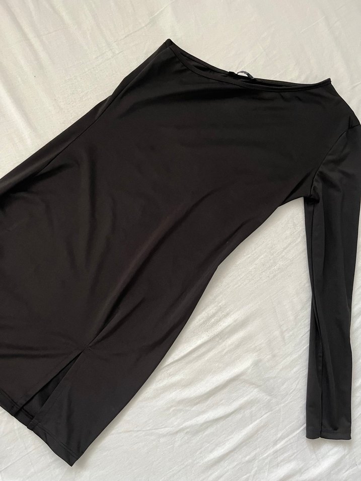Yarı straplez yırtmaçlı siyah mini elbise şık bir ürün