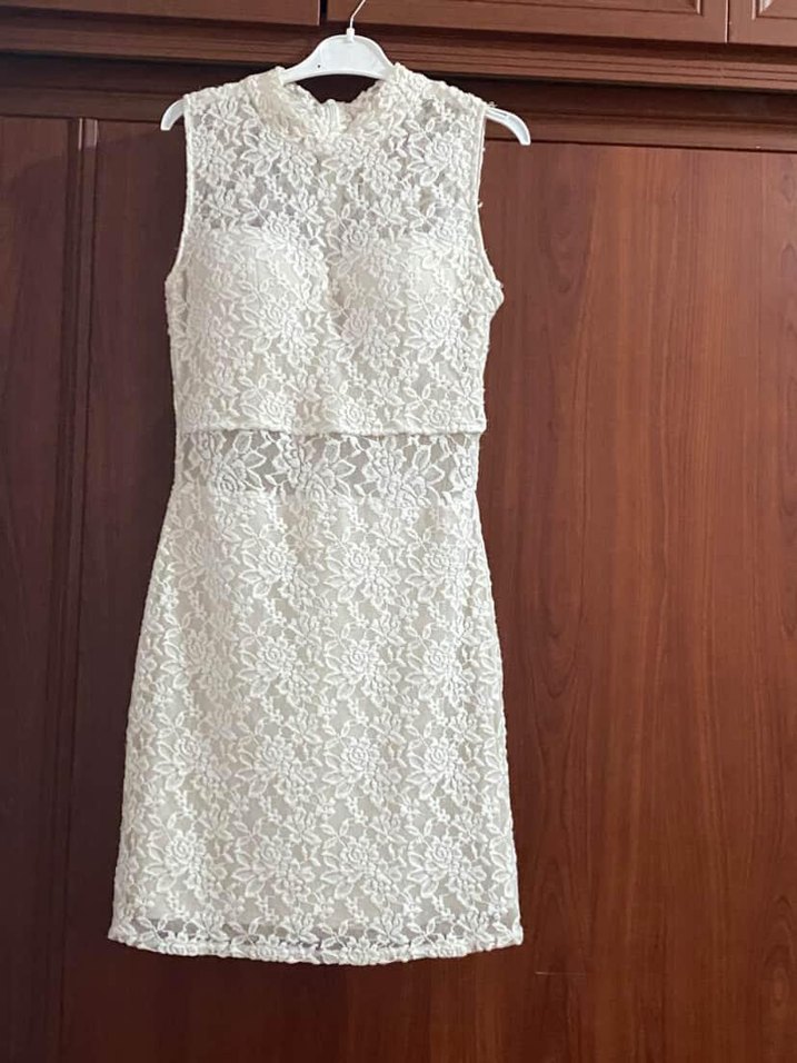 Beyaz elbise, zarif dantel detayları, dar kesim ve kolsuz. Minimalist bohem tarzıyla düğünler için uygundur. Nikahta bir kez giyildi.