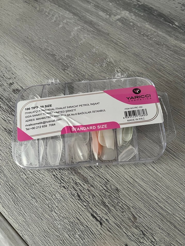 Yaricci markasına ait beyaz, standart boyda 100 adet tırnak ucu, 10 farklı boyda paketlenmiştir. Tırnak süslemede kullanıma uygundur.