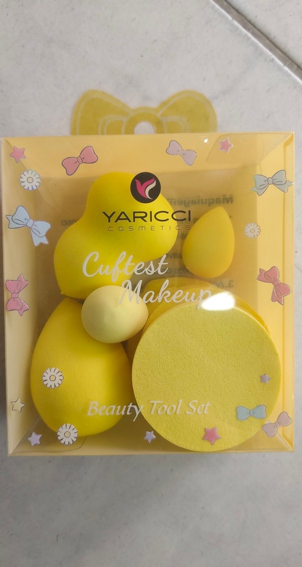 Yaricci markalı, çeşitli şekillerde pastel sarı makyaj süngerleri içeren set. Pürüzsüz uygulama sağlar.