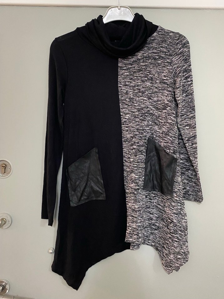 Yarım balıkçı yaka ve uzun kollu, bol kesim kadın tunik. Siyah ve desenli örgü kumaş, iki siyah suni deri cep içerir. Sokak tarzı için uygundur.