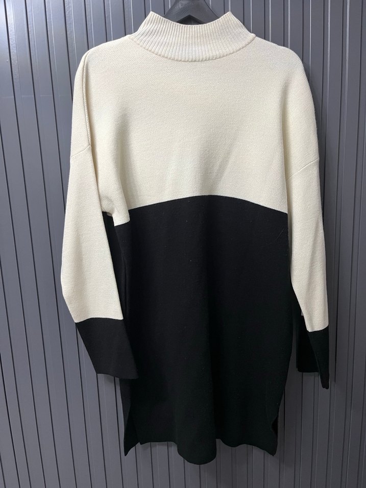 Kadınlar için yarım balıkçı yaka, uzun kollu, örgü dokulu, bol kesim ve uzun boy renk bloklu kazak. Yumuşak ve sıcak kumaştan üretilmiştir, rahat ve günlük kullanıma uygundur.