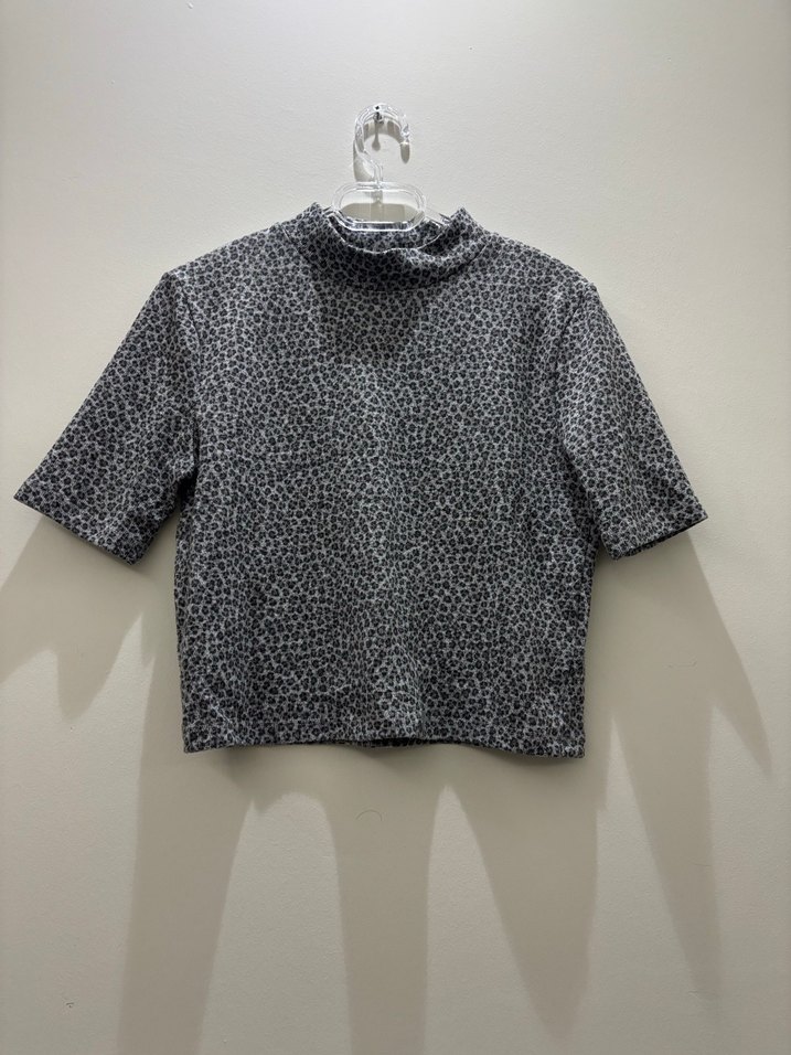Gri, kısa boy,yarım kollu ve yılan desenli, pamuklu kumaştan bluz.