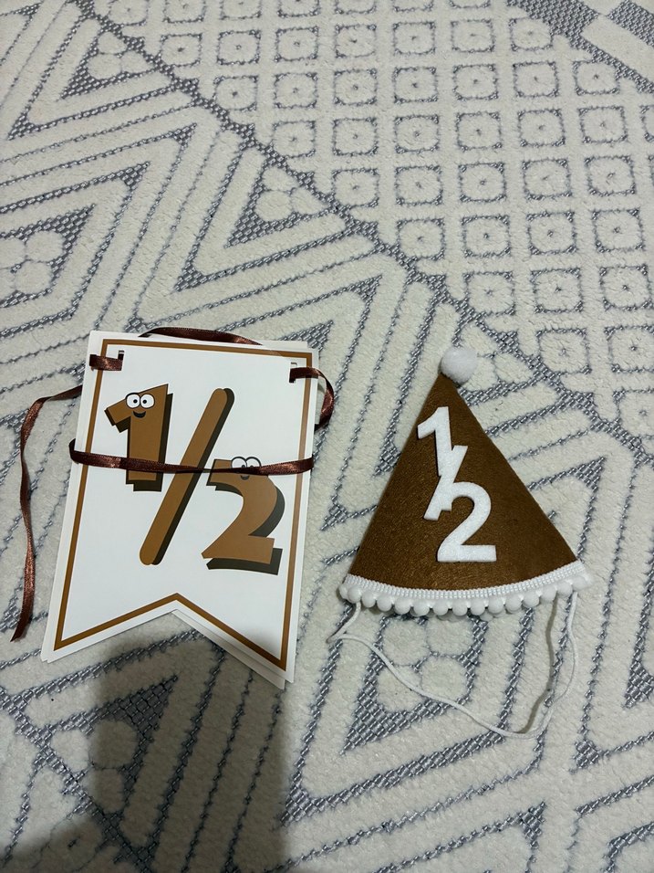 Yarım doğum günü için kahverengi ve gri renklerde, beyaz ponponlu şapka ve gözlü 1/2 yazılı süsleme afişi seti.