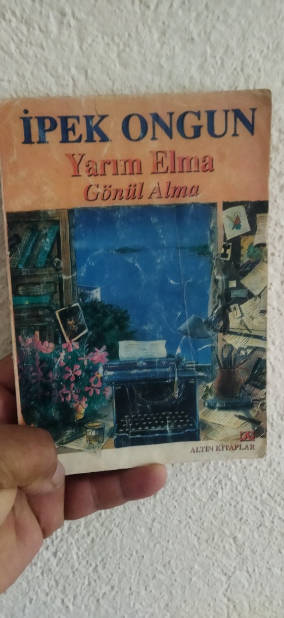 İpek Ongun'un 'Yarım Elma Gönül Alma' adlı romanı, Altın Kitaplar yayınevinden. Kapakta eski tip daktilo ve sıcak bir çalışma ortamı var.