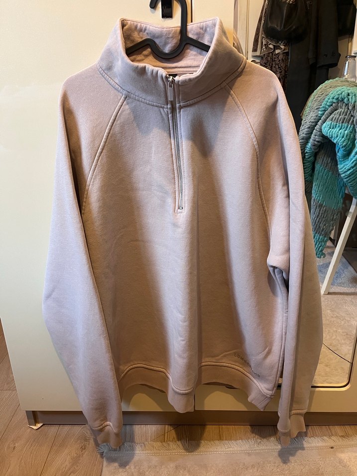 Yumuşak ve sıcak kumaştan yapılmış, yarım fermuarlı, yüksek yakalı, bol kesim kadın sweatshirtü. Uzun kollu ve desensiz, günlük sokak stili için uygundur.