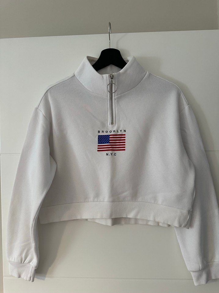 Yarım fermuarlı yüksek yakalı, uzun kollu beyaz crop sweatshirt. Önünde Amerikan bayrağı baskısı ve rahat kesimi ile günlük kullanıma uygun.