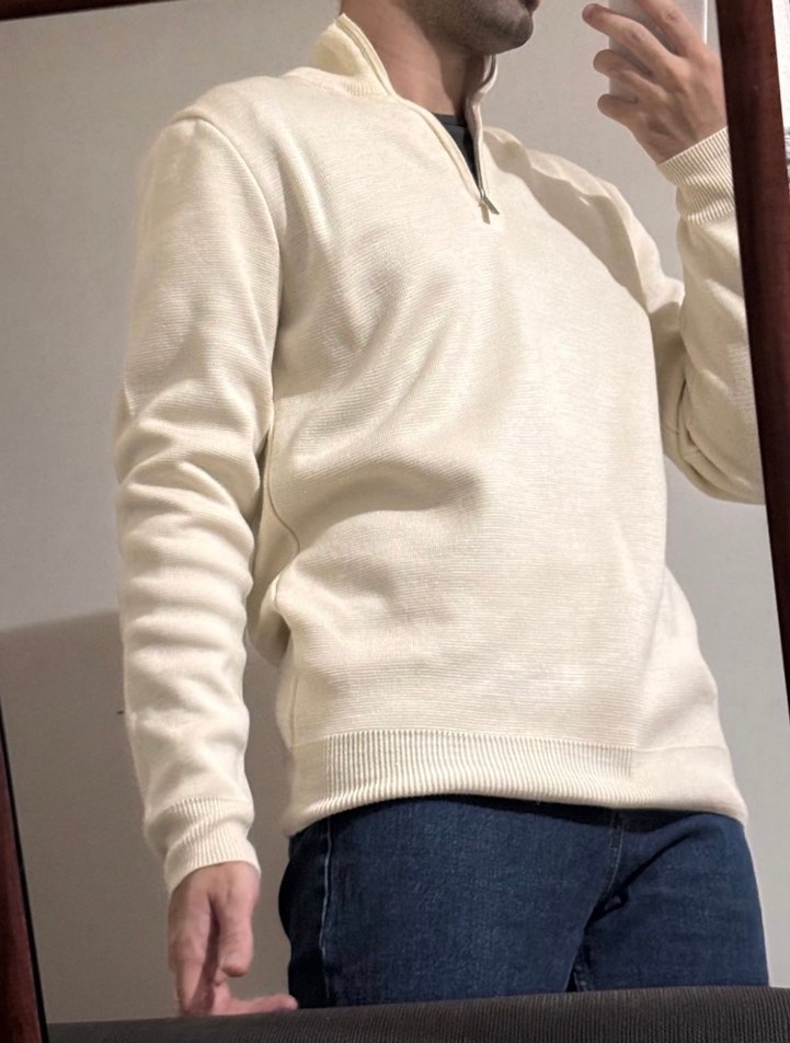 Yarım fermuarlı, yüksek yakalı ve uzun kollu erkek sweatshirtü. İnce kesimi ve yumuşak, sıcak kumaşıyla günlük sokak stiline uygundur. Açık beyaz renktedir.