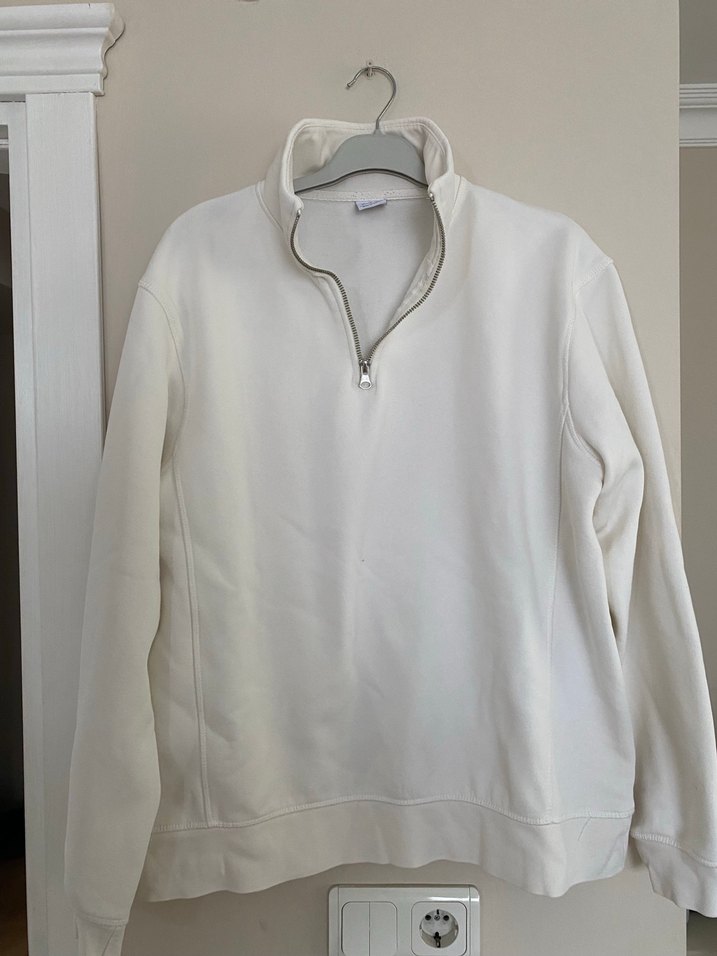 Yarım fermuarlı, uzun kollu, beyaz kadın sweatshirtü. Yumuşak ve sıcak kumaştan, bol kesim ve normal boyda, günlük kullanıma uygun.