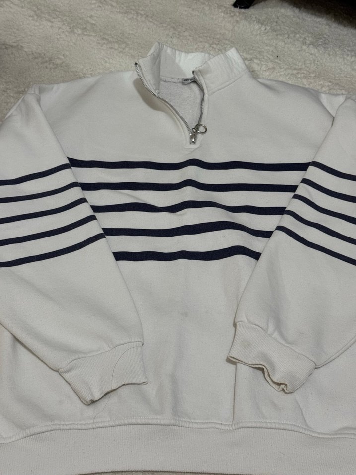 Yarım fermuarlı, yüksek yakalı ve uzun kollu sweatshirtü. Yumuşak ve sıcak kumaştan, beyaz üzerine gri yatay çizgili, rahat kesim.