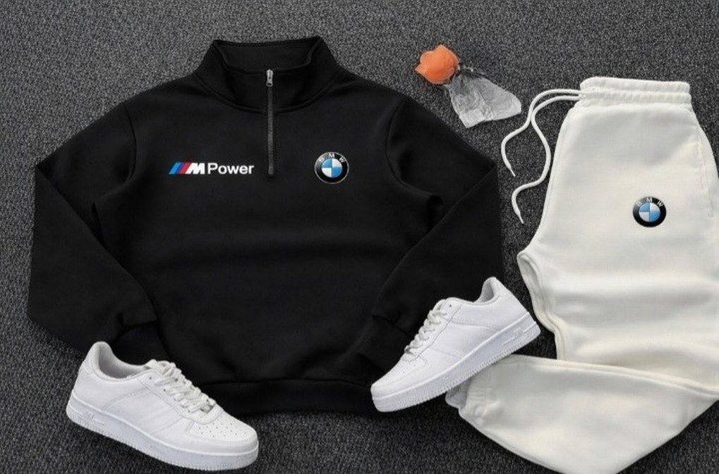 Yarım Fermuarlı Bmw Baskılı Siyah Eşofman Üst 2li