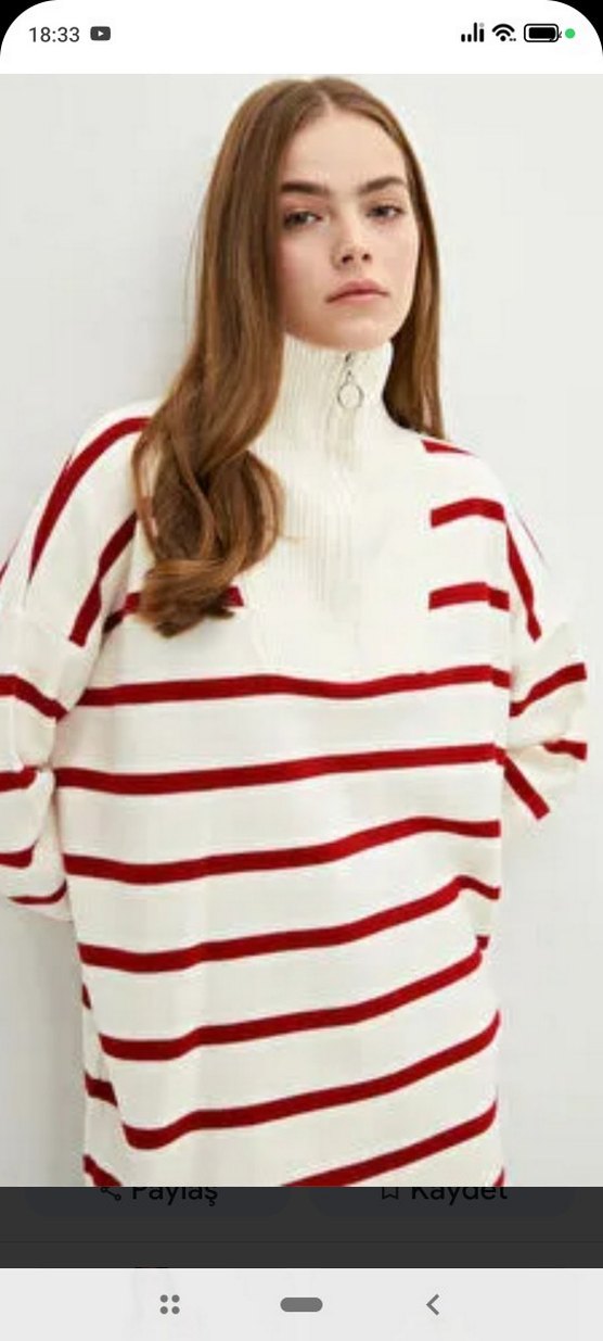 Beyaz, kırmızı çizgili, yarım fermuarlı yüksek yakalı, bol kesim triko kazak.