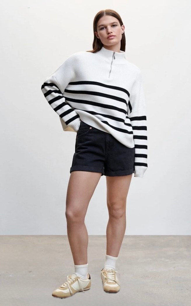 Yarım fermuarlı, uzun kollu, yüksek yakalı, çizgili desenli bol kesim triko kazak. Nispeten crop, günlük kullanıma uygun. Boyu yaklaşık 53cm, iki koltuk arası 73cm