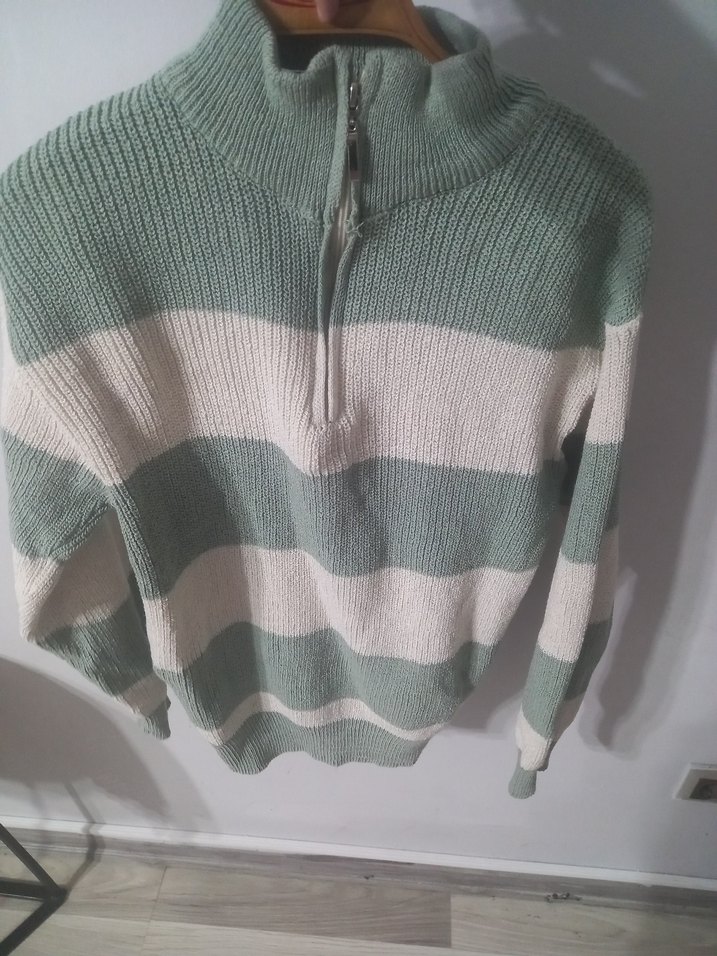 Yarım fermuarlı, yüksek yakalı, uzun kollu, gri ve beyaz çizgili triko kazak. Salaş kesimiyle rahat ve günlük stil için uygun.