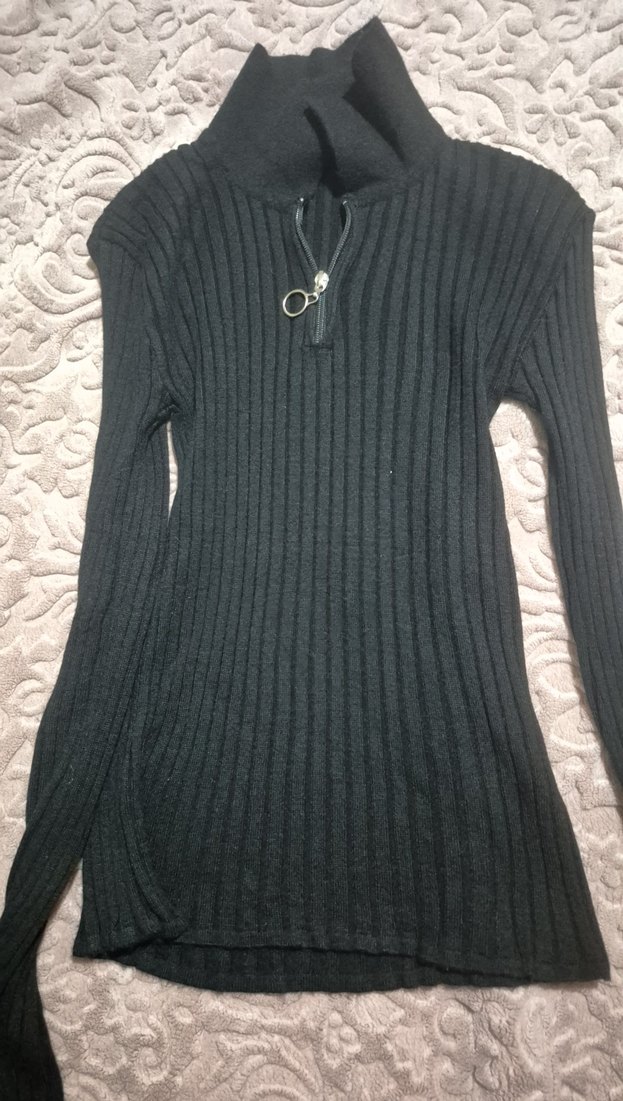 Yarım fermuarlı, yüksek yakalı, uzun kollu, gri renkte örme kumaştan yapılmış, rahat ve gotik tarzda kadın kazak.