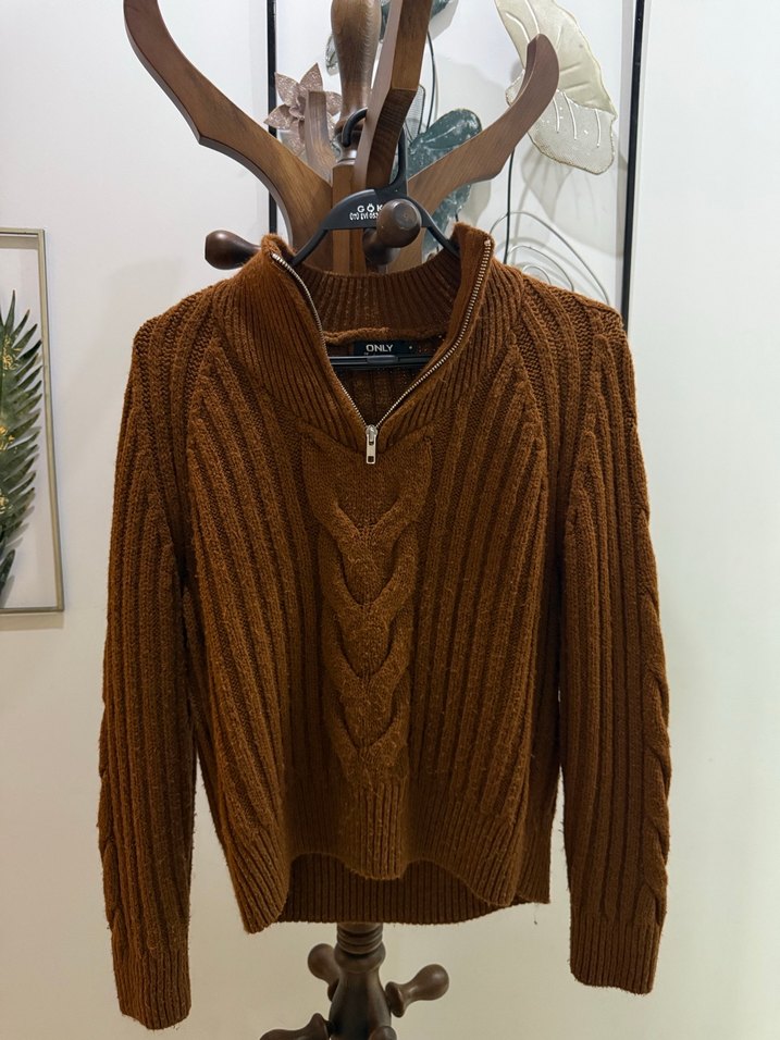 Yarım fermuarlı yüksek yakalı, uzun kollu, kahverengi örgü kazak. Normal boyu ve sıkı kesimiyle rahat ve şık bir günlük giyim parçası.