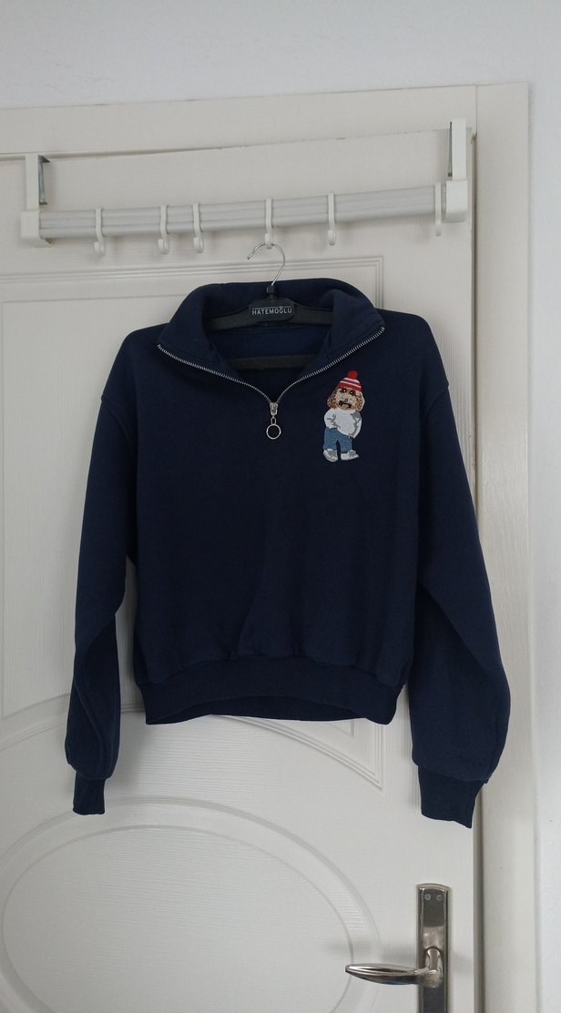 Yarım fermuarlı, yüksek yakalı koyu mavi kadın sweatshirt. Uzun kollu, bol kesim ve baskılı rahat tasarıma sahip. Günlük kullanıma uygun.