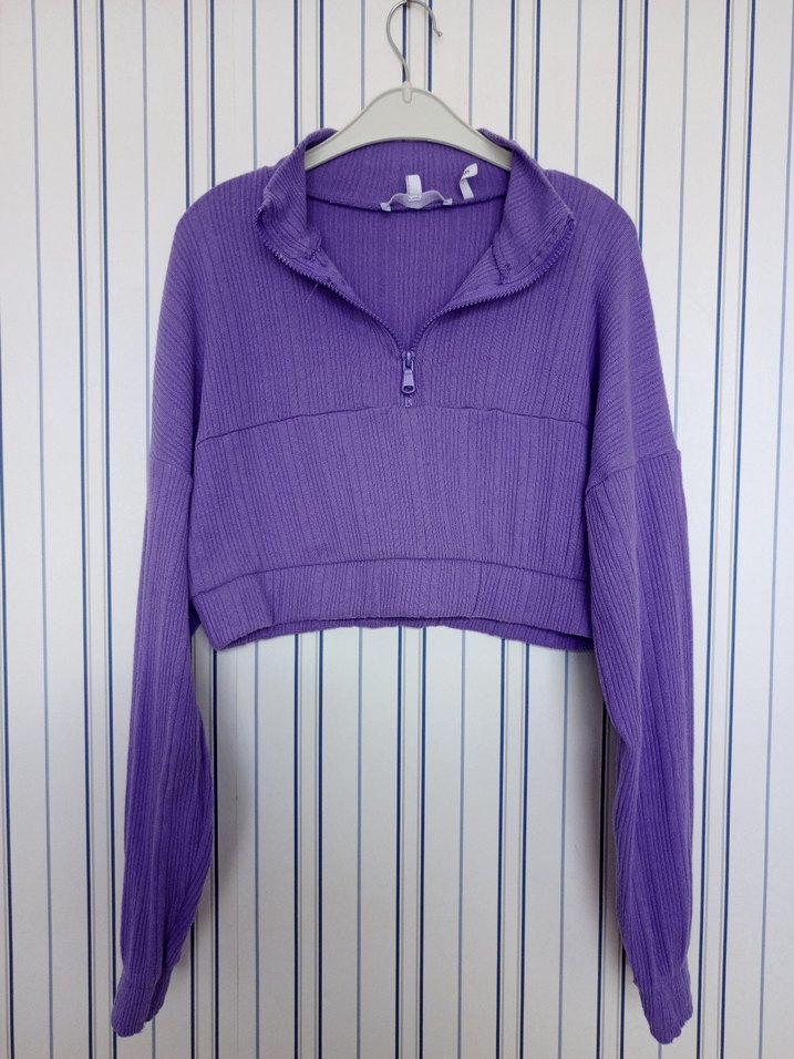 Mor renkli, yarım fermuarlı, uzun kollu ve bol kesim kadın sweatshirtü. Örgü yapısı ve kısa boyu ile rahat bir kullanım sunar .Fitilli kumaşı ve cropped kesimiyle kombinleri tamamlar