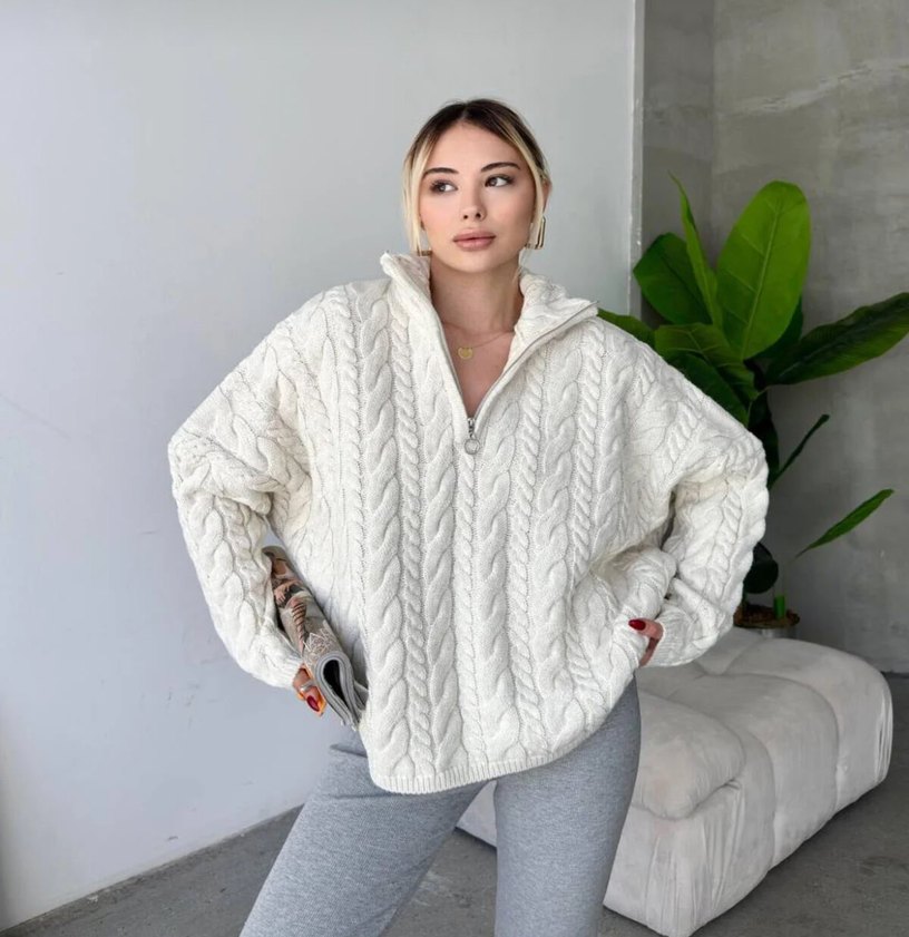 Yarım Fermuarlı Örgülü Triko Kazak