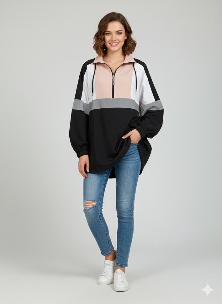 Marka: LCW Modest Beden: 36 Beden (Ancak oversize kesim olduğu için 38/40 bedenlere de rahatlıkla uyar. Renk/Desen: Siyah, Pembe ve Beyaz Renk Bloklu Kumaş İçeriği: %55 Pamuk, %45 Polyester (Hafif, rüzgar ve neme dayanıklı/yağmurluk tarzı kumaş.) Durum: HIÇ KULLANILMADI / SIFIR ÜRÜN! ✨ Öne Çıkan Özellikler • Model: Kapüşonlu, önü yarım fermuarlı (Half-zip) rüzgarlık/ince mont. • Kesim: Trend olan Oversize ve rahat kesim. • Tasarım: Siyah, pembe ve beyazın uyumlu renk blokları ile sportif ve dinamik bir görünüm sunar. • Kumaş Özelliği: Işıkta parlayan (Reflektif/Parlak) bir yüzeye sahiptir. • Kullanım: Spor yaparken, günlük kombinlerde veya yağmurlu/rüzgarlı havalarda koruyucu olarak kullanılabilir. Detaylı Ölçüler • Ürün Boy Uzunluğu: 78.5 cm • İki Koltuk Altı Arası Mesafe (En): 54.5 cm