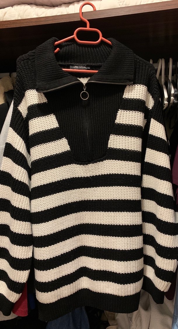 Yarım fermuarlı, yüksek yakalı, siyah beyaz çizgili, uzun kollu ve midi boyda kadın kazak. Rahat ve şık sokak stili için uygundur.