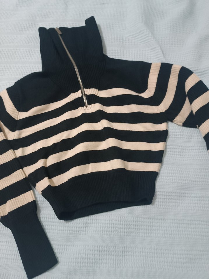 Yarım fermuarlı, uzun kollu, siyah çizgili triko kazak, rahat ve şık sokak stili için uygundur.
