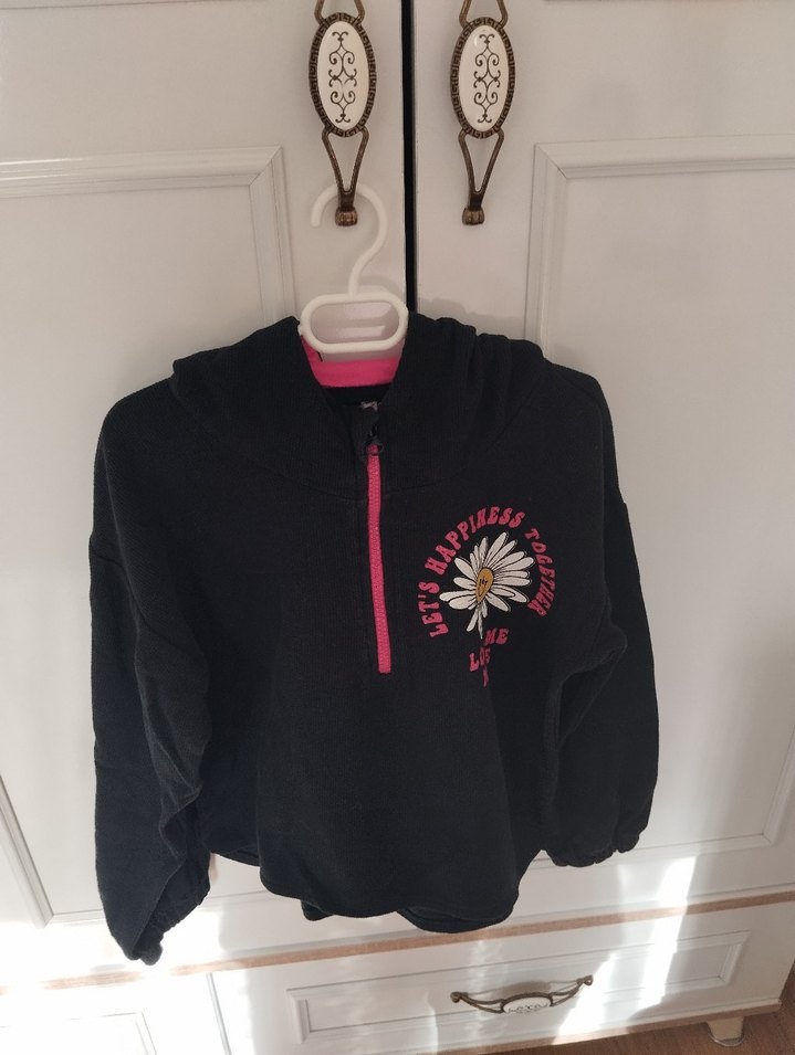 Yarım fermuarlı, uzun kollu, siyah sweatshirt. Yüksek yakalı ve baskılı çiçek deseniyle günlük kullanıma uygun, bol kesim ve yumuşak, sıcak kumaş.