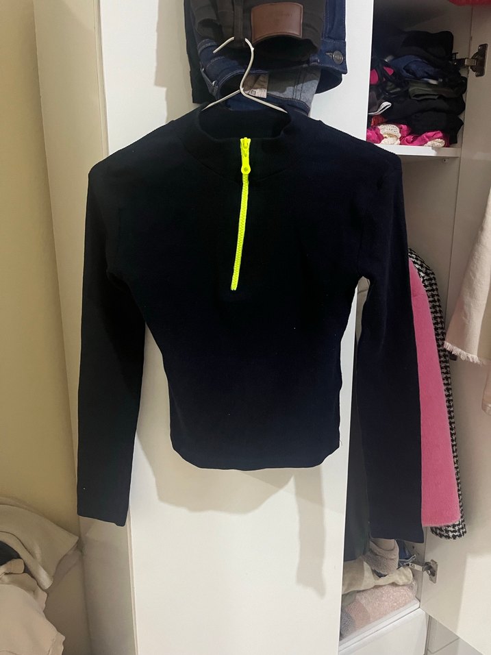 Uzun kollu, yüksek yakalı, neon sarı fermuarlı siyah kadın sweatshirt. Sentetik kumaştan, sokak modasına uygun, dar kesim.